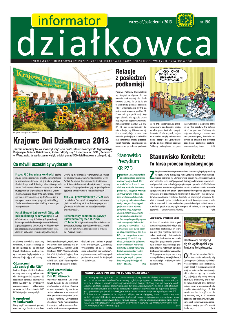 Do wszystkich Okręgowych Zarządów oraz rodzinnych ogrodów działkowych wysłany został najnowszy numer „Informatora działkowca”. Można w nim znależć m.in. informacje na temat manipulacji posłów PO w pracach podkomisji nad nową ustawą działkową, stanowiska Komitetu iKR PZD w tej sprawie, a także relację z Krajowych Dni Działkowca. Zachęcamy do czytania! Informator w wersji elektronicznej: id_IX-X.pdf